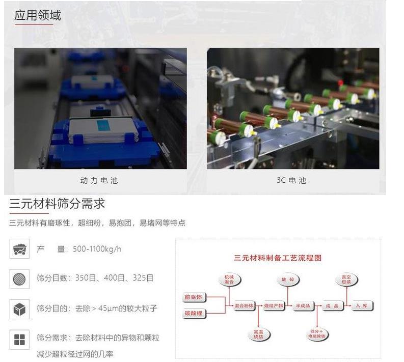 由于超聲波振動(dòng)在新能源行業(yè)的**表現(xiàn),在線清網(wǎng)效果明顯,對于比較難篩分的物料有其顯著的效果。