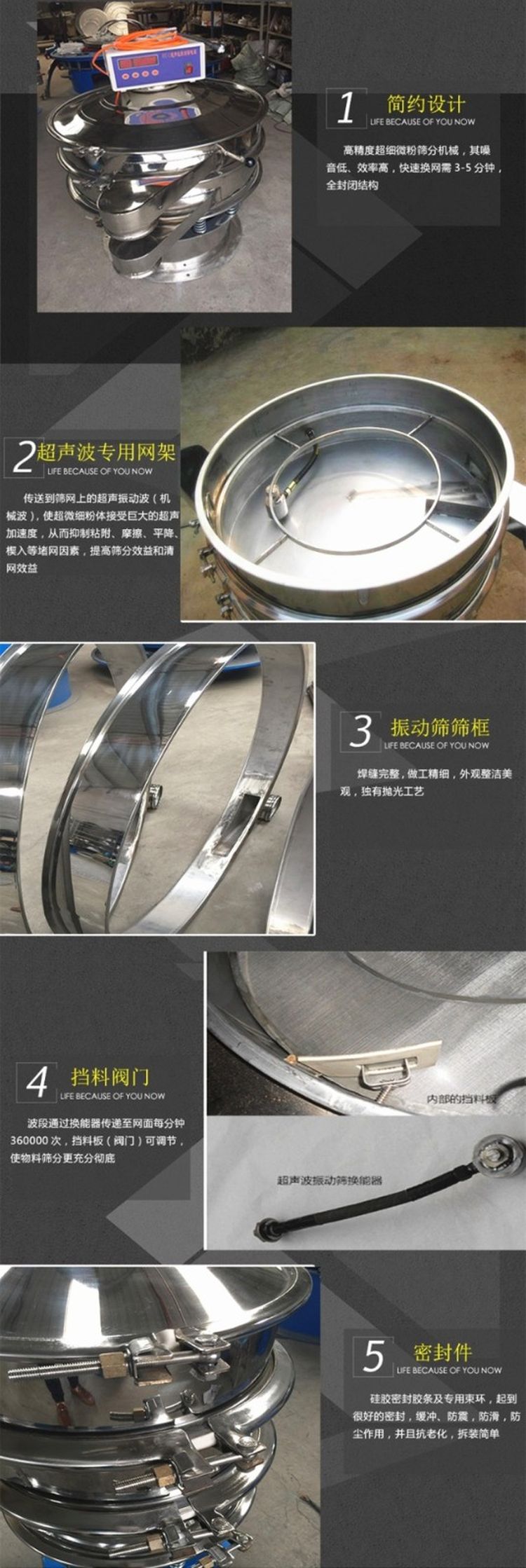 超聲波振動(dòng)篩是在旋振篩的基礎(chǔ)上引入了超聲波清網(wǎng)裝置,通過將220V、50Hz或110V、60Hz電能轉(zhuǎn)化為18KHz的高頻電能,輸入超聲換能器,將其變成18KHz機(jī)械振動(dòng),從而達(dá)到高篩分和迅速清網(wǎng)的目的,使超微細(xì)粉篩分成為易事。該系統(tǒng)在傳統(tǒng)的振動(dòng)篩基礎(chǔ)上在篩網(wǎng)上引入一個(gè)低振幅、高頻率的超聲振動(dòng)波(機(jī)械波),以改善超微細(xì)粉體的篩分性能。特別適合高附加值精細(xì)粉體的用戶使用。超聲波篩分系統(tǒng)是一種簡單實(shí)用、可靠的篩分系統(tǒng),是當(dāng)前網(wǎng)孔堵塞的有效的解決方法??蓮V泛應(yīng)用于制藥、冶金、化工、選礦、食品等要求精細(xì)篩分過濾的行業(yè),篩分過濾精度高,有效解決因團(tuán)聚、靜電、強(qiáng)吸附性卡堵網(wǎng)孔等篩分難題,是國內(nèi)篩分行業(yè)的一項(xiàng)重大技術(shù)突破。