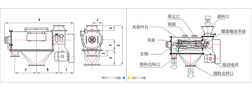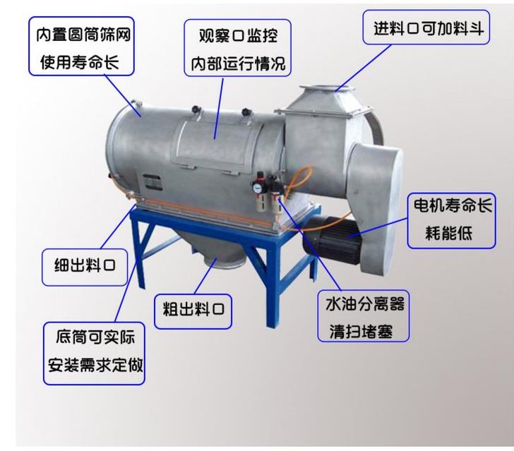 通過網(wǎng)筒內(nèi)風(fēng)輪葉片使物料同時受離心力和旋風(fēng)推進力,從而迫使物料噴射過網(wǎng),由細料排出口排出,不能過網(wǎng)的物料沿網(wǎng)筒壁從粗料排出口排出。