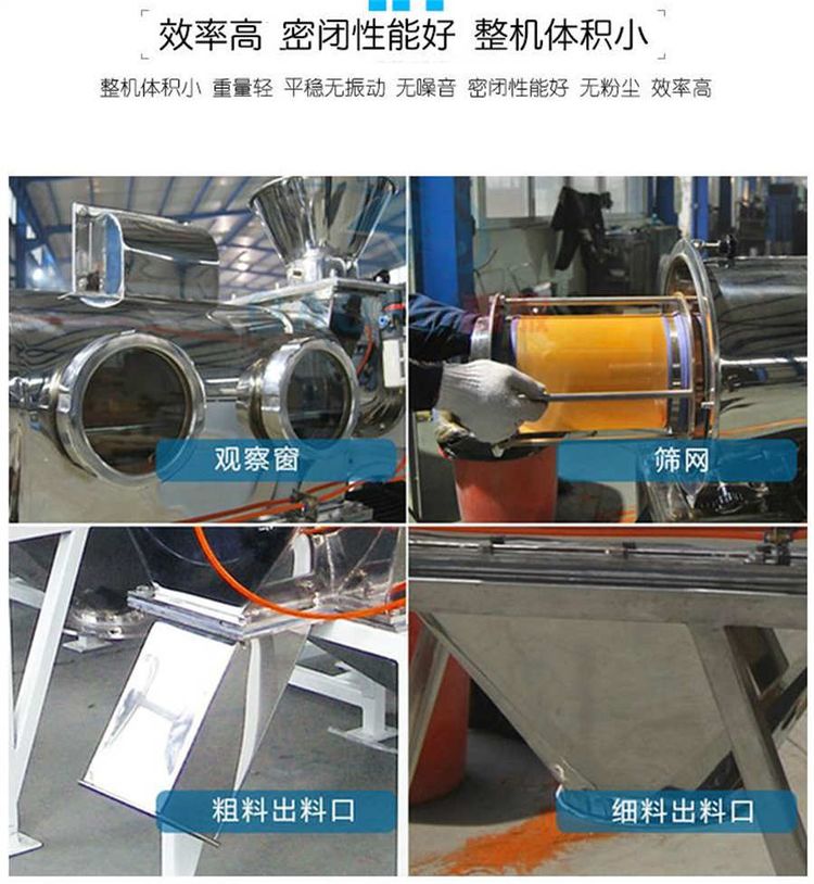 不能過網(wǎng)的物料沿筒壁從粗料排出口排出,達到快速分離的目的。
