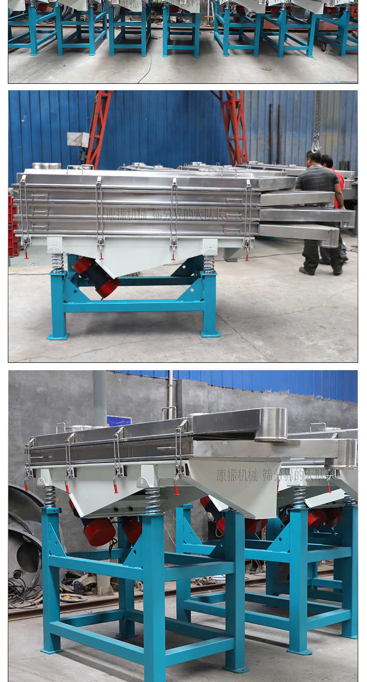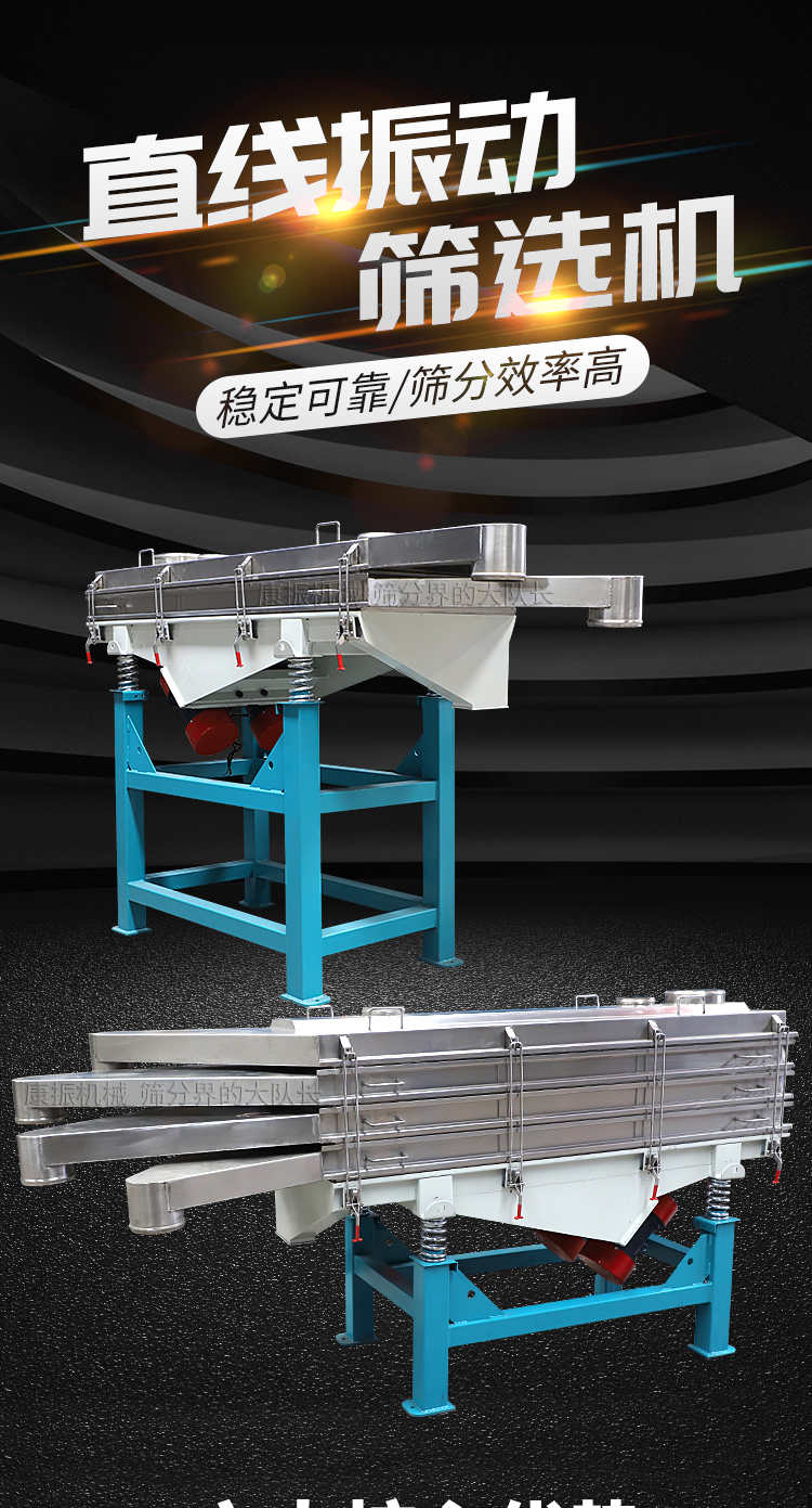直線振動篩利用振動電機(jī)激振作為振動源,使物料在篩網(wǎng)上被拋起,同時向前作直線運(yùn)動,物料從給料機(jī)均勻地進(jìn)入篩分機(jī)的進(jìn)料口,通過多層篩網(wǎng)產(chǎn)生數(shù)種規(guī)格的篩上物、篩下物、分別從各自的出口排出。具有耗能低、產(chǎn)量高、結(jié)構(gòu)簡單、易維修、全封閉結(jié)構(gòu),無粉塵溢散,自動排料,更適合于流水線作業(yè)。