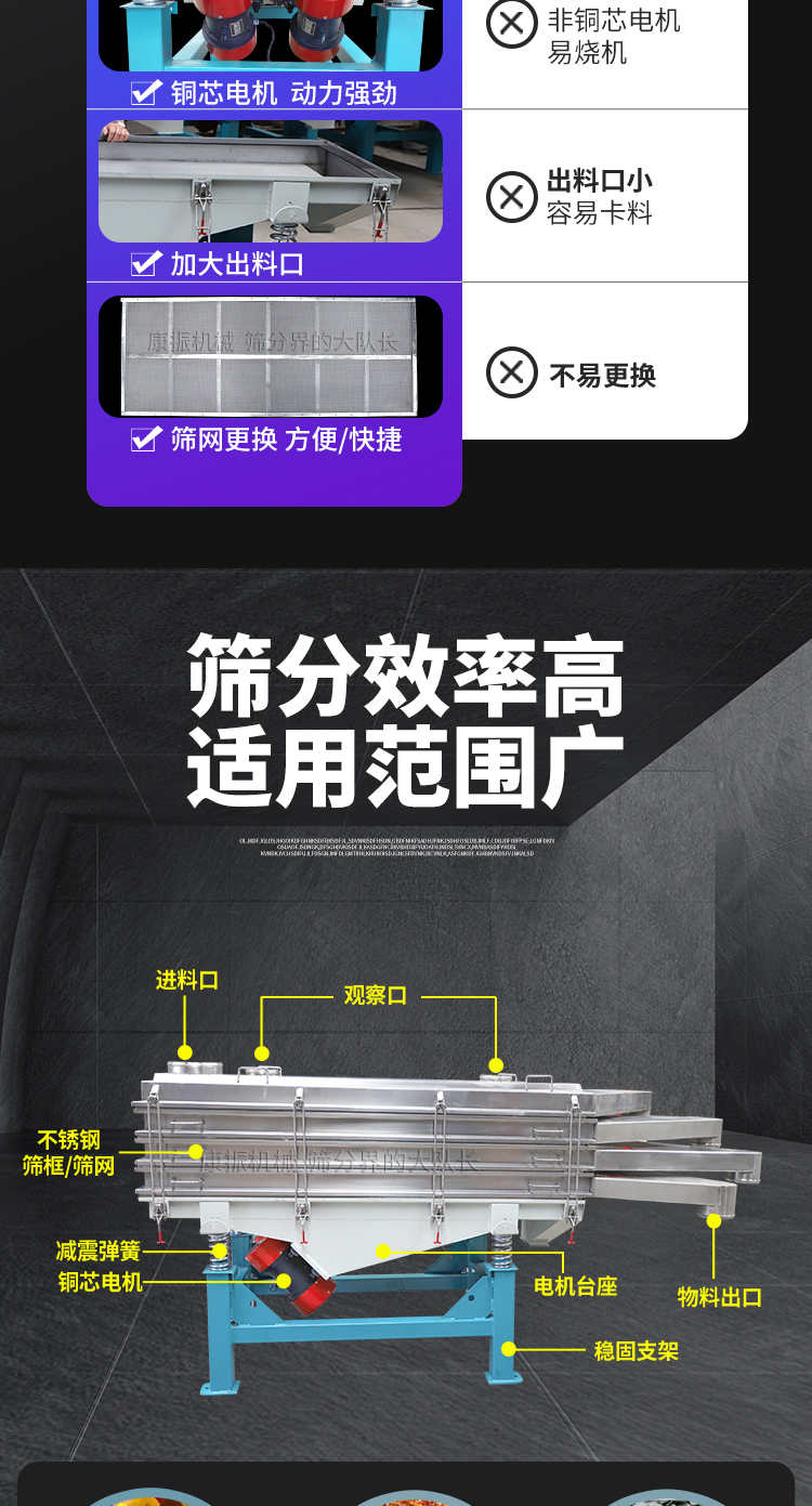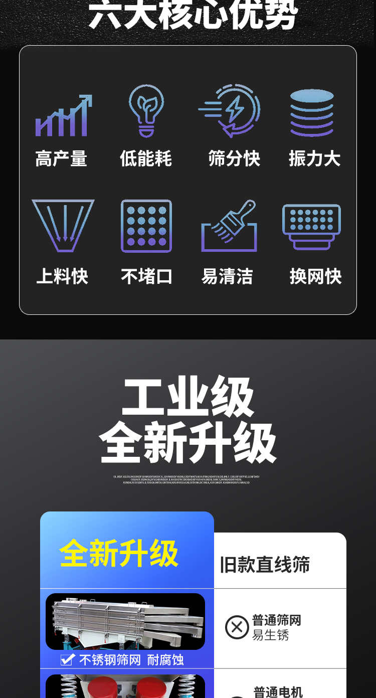 直線振動篩(直線篩)穩(wěn)定可靠、消耗少、噪音低、壽命長、振型穩(wěn)、篩分效率高等優(yōu)點。