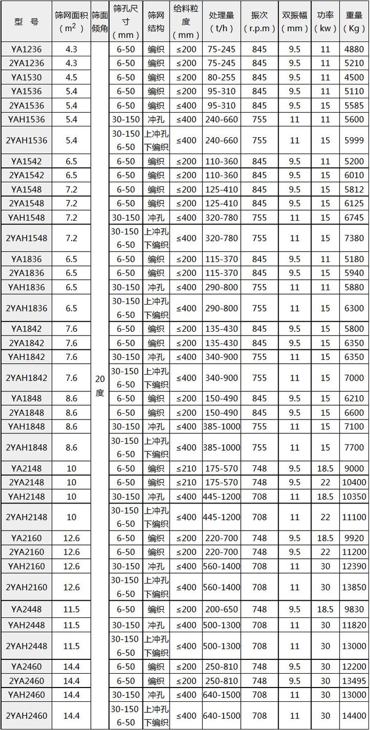 YA系列圓振動(dòng)篩的主要技術(shù)參數(shù):