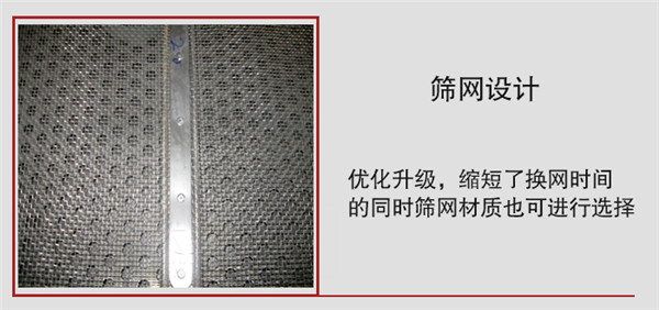 3,篩網(wǎng)設(shè)計進行優(yōu)化升級,縮短了換網(wǎng)時間的同時篩網(wǎng)材質(zhì)也可進行選擇。