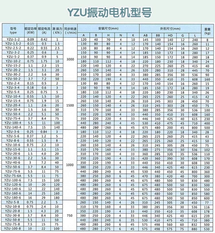 YZUL振動電機技術參數(shù)表