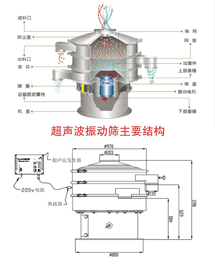 超聲波振動(dòng)篩主要由換能器、超聲波電源、振動(dòng)電機(jī)、減震彈簧、防塵蓋等部分組成。超聲波振動(dòng)篩可將各種常用的低頻電能轉(zhuǎn)化為高達(dá)38KHz的高頻電能,再通過(guò)超聲換能器,zui終得到一個(gè)38KHz機(jī)械振動(dòng),既能夠提高篩分精度,又可以減少物料的堵網(wǎng)現(xiàn)象。
