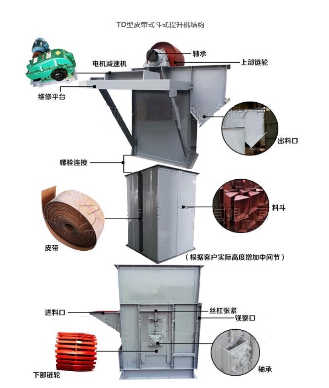TD型斗式提升機由運行部分(料斗與牽引膠帶),帶有傳動滾筒的上部區(qū)段、帶有拉緊滾筒的下部區(qū)段、中間機殼、驅(qū)動裝置、逆止制動裝置等組成。適用于向上輸送松散密度ρ<1.5t/m3粉狀、粒狀和小塊狀的無磨琢性和半磨琢性散狀物料,如煤、砂、焦末、水泥、碎礦石等。另一種鋼絲繩芯膠帶斗式提升機,由于它的牽引構(gòu)件為鋼絲繩芯膠帶所以比TD型的橡膠帶具有更好的耐磨抗拉效果。